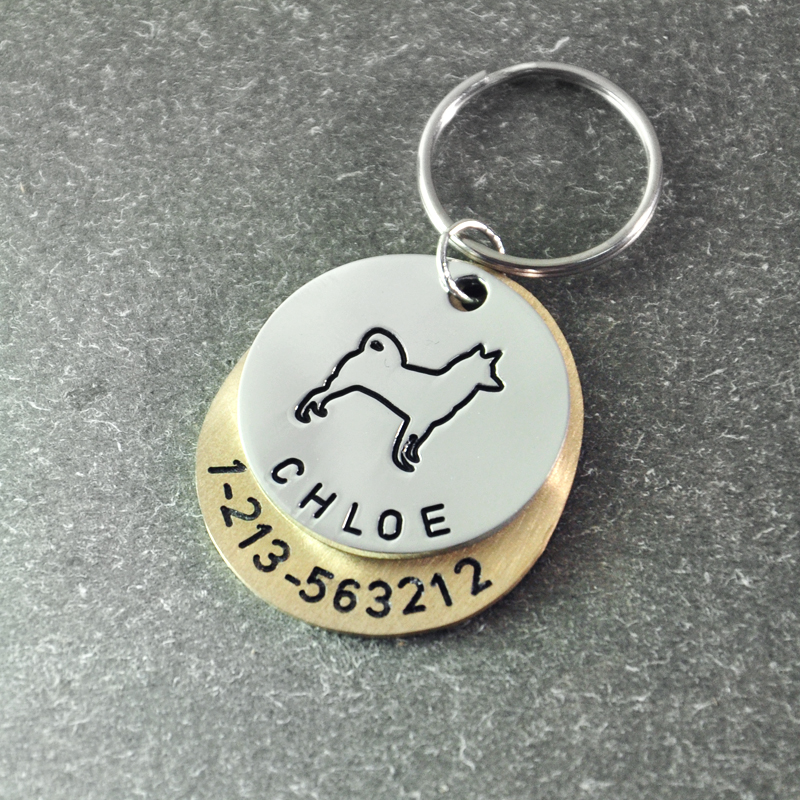 Dierenpenning in de vorm van een Jack-russel. Op de hondenpenning wordt een naam gegraveerd. Achter...