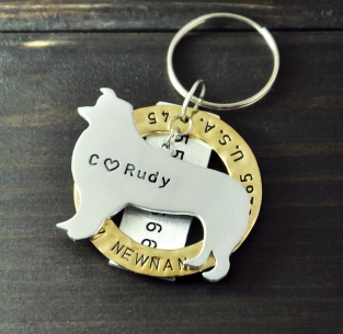 Dierenpenning rond met gravure van een Welsh Corgi. Op de hondenpenning wordt een naam...