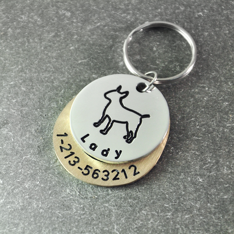Dierenpenning rond met gravure van een Bull Terrier. Op de hondenpenning wordt een naam gegraveerd. Achter de hondenpenning wordt een ronde penning met telefoonnummer verwerkt. De prijs van deze RVS dierenpenning is inclusief het graveren van een tekst aan de voorzijde. Voor het graveren van de voor en achterzijde betaalt u een meerprijs van € 5,00. De teksten voegt u eenvoudig toe in de vervolgstappen.