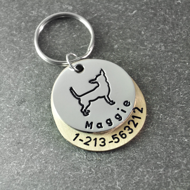 Dierenpenning in de vorm van een Mechelse herder. Op de hondenpenning wordt een naam gegraveerd....