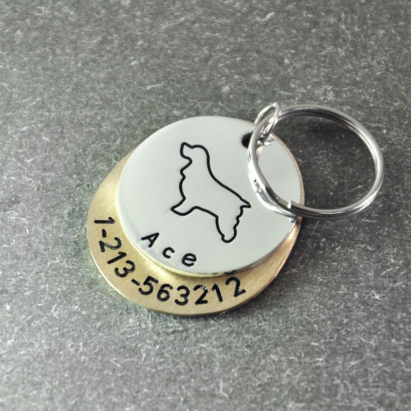 Dierenpenning in de vorm van een Border-Collie. Op de hondenpenning wordt een naam gegraveerd....