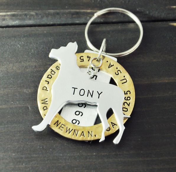 Dierenpenning in de vorm van een Duitse Dog. Op de hondenpenning wordt een naam gegraveerd. Achter de hondenpenning wordt een ronde penning met adres en een rechthoekige penning met telefoon gemonteerd. De prijs van deze RVS dierenpenning is inclusief het graveren van een tekst aan de voorzijde. Voor het graveren van de voor en achterzijde betaalt u een meerprijs van € 5,00. De teksten voegt u eenvoudig toe in de vervolgstappen.