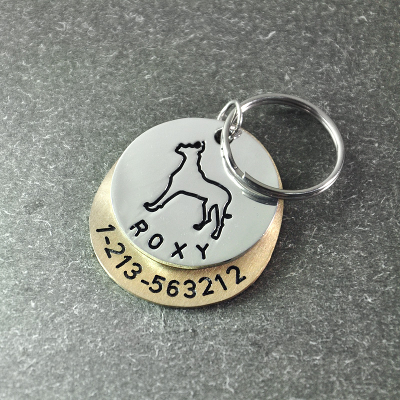 Dierenpenning in de vorm van een Duitse Dog. Op de hondenpenning wordt een naam gegraveerd. Achter...