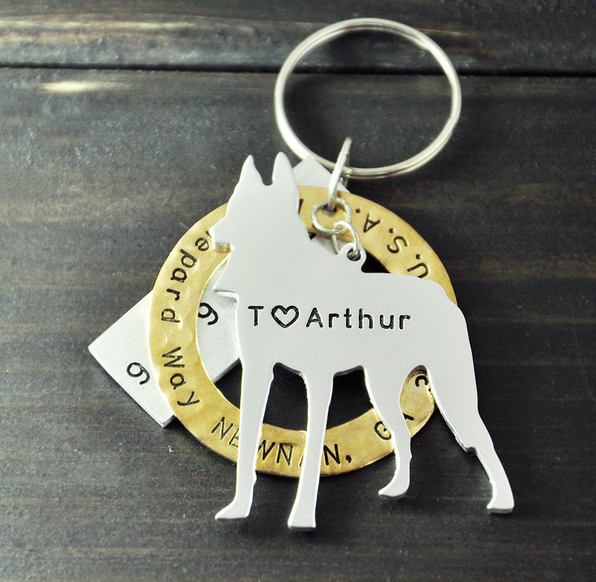 Dierenpenning in de vorm van een Duitse Dog. Op de hondenpenning wordt een naam gegraveerd. Achter...