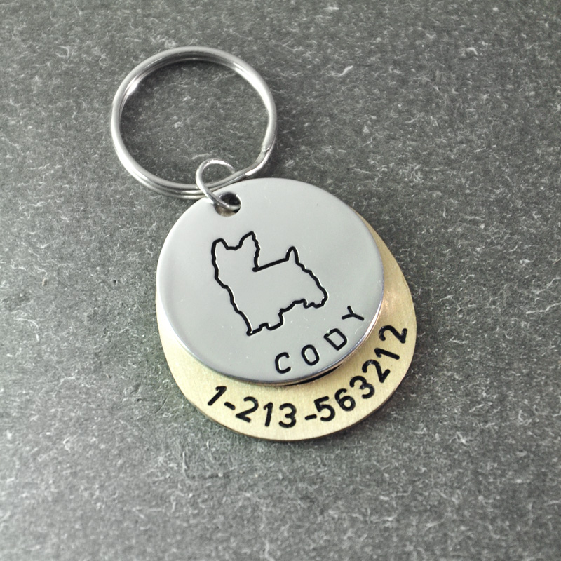 Dierenpenning in de vorm van een Airedale Terrier. Op de hondenpenning wordt een naam gegraveerd....