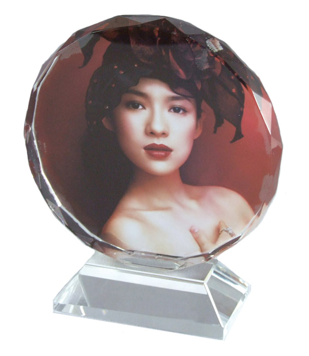 Prachtig rond fotokristal met ondervoet. Het kristal is 11x10cm groot. Uw eigen foto wordt in kleur aangebracht met een speciale printtechniek. De foto blijft licht doorzichtig wat een prachtig effect geeft.