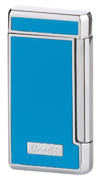 Deze Caseti aansteker heeft een Lichtblauwe afwerking met een chromen rand. Deze aansteker heeft een elektrische ontsteking. De aansteker geeft een krachtige dubbele jetflame, waarvan de vlamhoogte instelbaar is.
