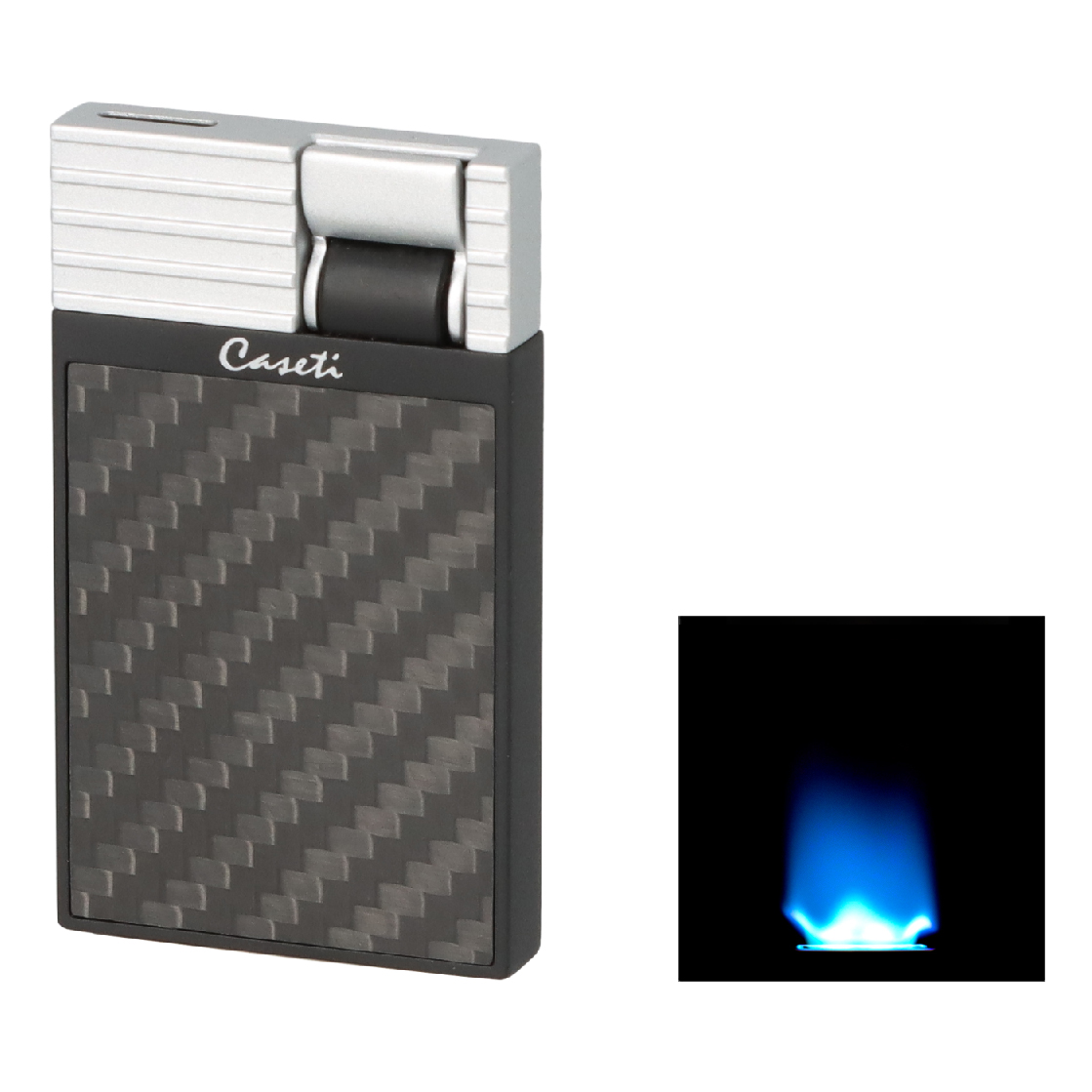 Deze Caseti aansteker heeft een mat zwarte carbon afwerking met een chroom klepje. Ook heeft deze aansteker een ribbel op de voor en achterzijde. Deze aansteker heeft een elektrische ontsteking. De aansteker geeft een Flat Flame, waarvan de vlamhoogte instelbaar is.