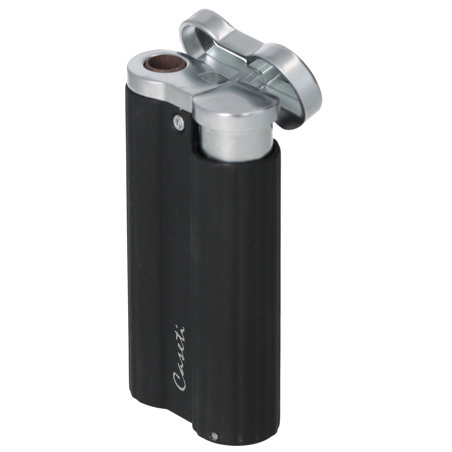 Deze Caseti aansteker heeft een mat zwarte afwerking met een chroom klepje. Dit klepje heeft een magneet sluiting wat zorgt voor een soepele sluiting. Deze aansteker heeft een elektrische ontsteking. De aansteker geeft een krachtige jetflame, waarvan de vlamhoogte instelbaar is. Ook heeft deze aansteker een punch.