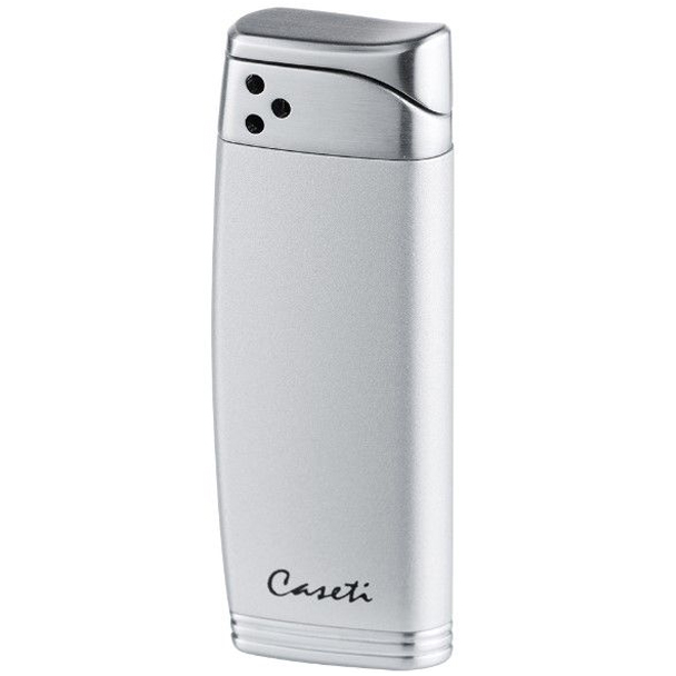 Caseti Piezo aansteker in de kleur silver matte - chrome. Deze aansteker heeft een elektrische ontsteking. De aansteker geeft een mooie zachte vlam. De vlamhoogte is instelbaar.