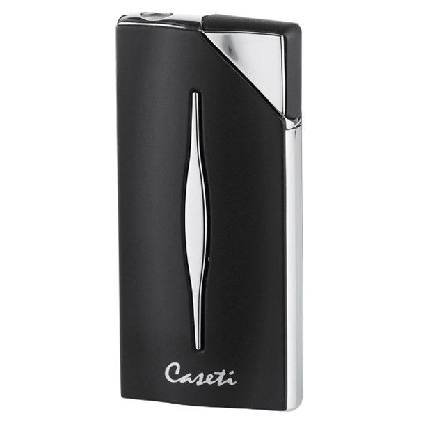 Caseti Single jetflame aansteker in de kleur zwart met chromen elementen.  Deze aansteker heeft een elektrische ontsteking. De aansteker geeft een krachtige jetflame vlam. De vlamhoogte is instelbaar.