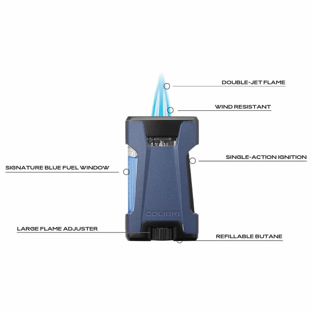 Colibri aansteker Double flame rebel in de kleur navy. Deze Colibri aansteker heeft twee krachtige stormvlammen en een electronische ontsteking. De aansteker werkt op butaangas en is windbestendig. De aansteker is eenvoudig te bedienen door de grote knop aan de zijkant en de grote vlamregelaar aan de onderzijde waarmee u de sterkte van de vlam in kunt stellen. De andere zijkant bevat een blauwe gas indicator waardoor u gemakkelijk kan zien hoe vol de aansteker is. De aansteker is hervulbaar.
