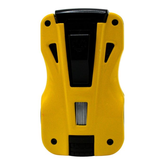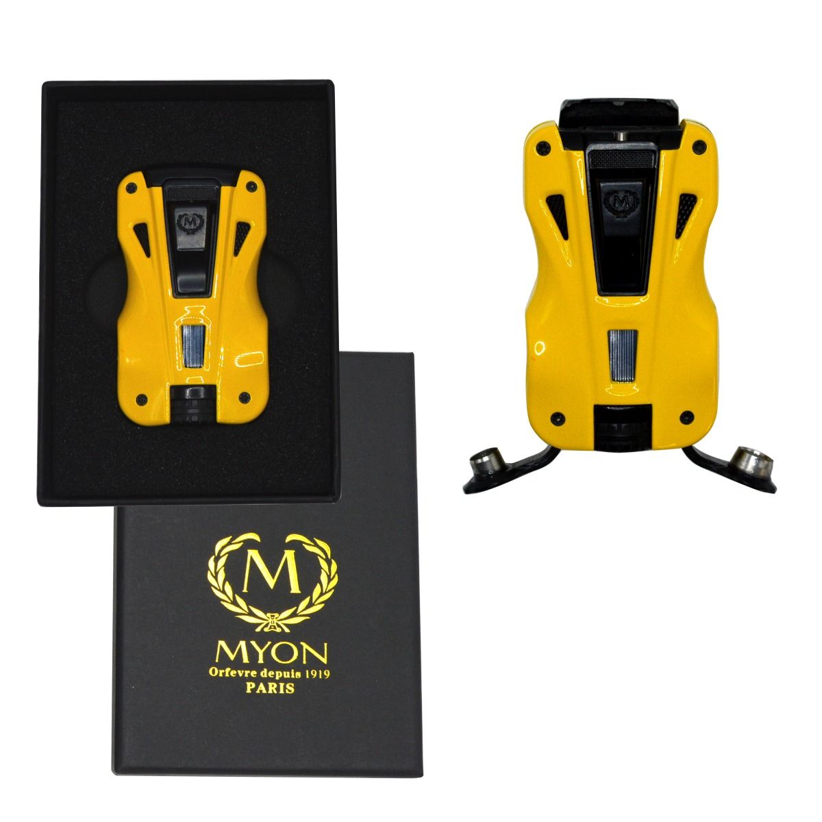 Gele Myon Le Camp sigaren aansteker met een elektrische ontsteking en twee krachtige jet vlammen. Na het openklappen van het klepje kan de aansteker eenvoudig ontstoken worden door middel van de drukknop. Aan de zijkanten van de aansteker zitten twee punches met verschillende afmeting, welke eenvoudig naar buiten geklapt kunnen worden.