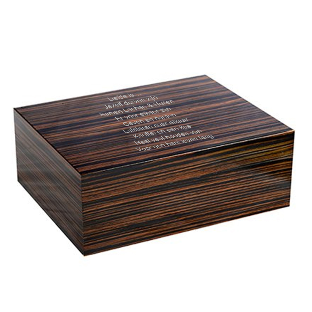Maak deze humidor onvergetelijk door een eigen tekst te laten bedrukken in een kleur naar keuze. De print is van hoge kwaliteit en vervaagt niet, zodat je er jarenlang plezier van hebt. Of het nu gaat om een naam, een speciale datum, een persoonlijke quote of de initialen van een dierbare, wij zorgen ervoor dat jouw boodschap er prachtig op komt te staan. Kies uit verschillende lettertypen om de tekst perfect aan te laten sluiten bij jouw stijl: