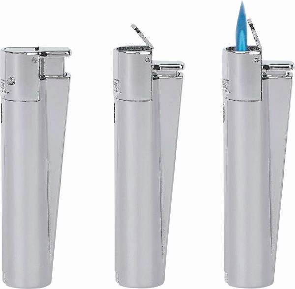Metalen Clipper aansteker met een elektronische ontsteking. De aansteker is hoogglans chroom en geeft een prachtige stromvlam.