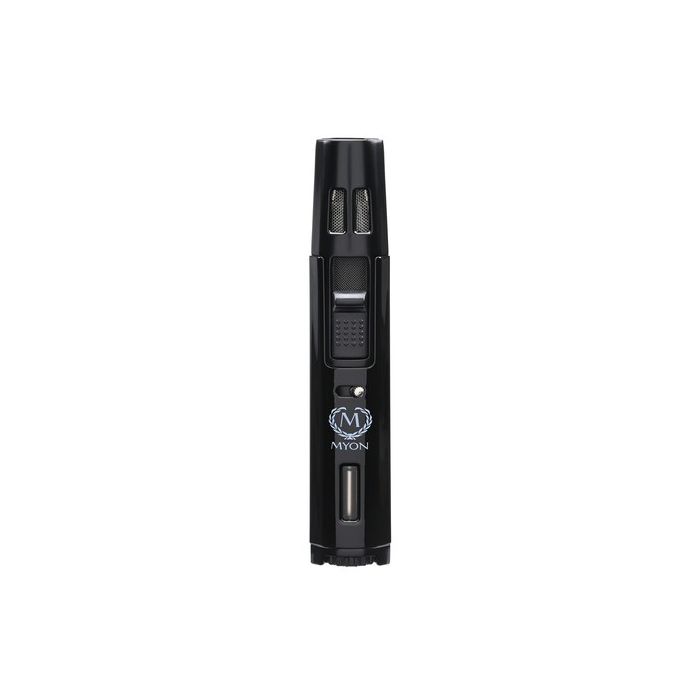 Deze Myon aansteker heeft een zwarte afwerking. De aansteker heeft een elektrische ontsteking met een dubbele jetflame, waarvan de vlamhoogte instelbaar is.