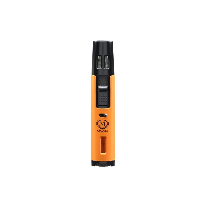 Deze Myon aansteker heeft een gele afwerking. De aansteker heeft een elektrische ontsteking met een dubbele jetflame, waarvan de vlamhoogte instelbaar is.