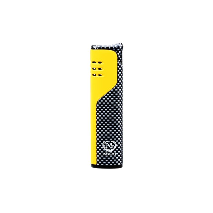 Deze Myon aansteker heeft een Carbon afwerking met gele details. De aansteker heeft een elektrische ontsteking met een single jetflame, waarvan de vlamhoogte instelbaar is.