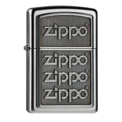Deze Zippo aansteker heeft een satin chrome afwerking met aan de voorzijde een 3D emlbeem, waarop het Zippo logo viermaal te zien is.