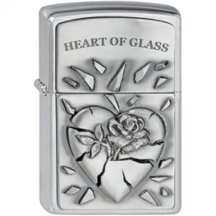 Deze Zippo aansteker heeft een brushed chrome afwerking met een embleem aan de voorzijde, waarop een een gebroken hart, waaruit een roos groeit te zien is met de tekst ‘Heart of Glass’ hierboven.