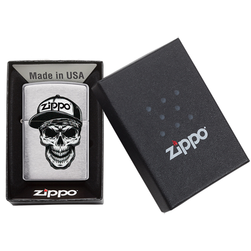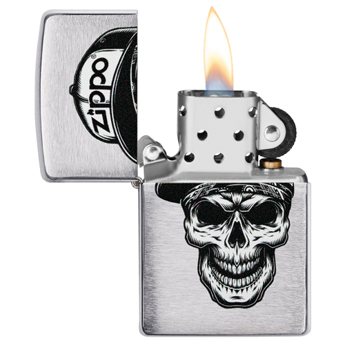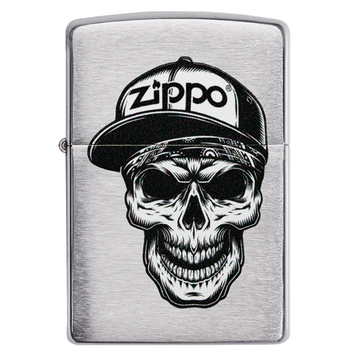 De Zippo aansteker heeft een geborsteld chromen afwerking en is aan de voorzijde voorzien van een slijtvaste print van een schedel met een petje.