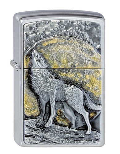 Deze Zippo aansteker heeft een geborsteld chromen afwerking aan de voorzijde en de achterzijde, en aan de voorzijde een 3D embleem met hierop een wolf die huilt naar het gele maanlicht. De zijkanten zijn rondom hoogglans chrome afgewerkt.