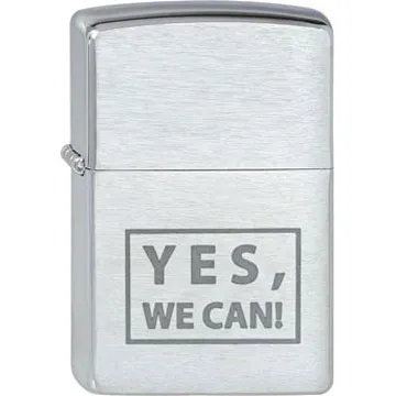 Deze Zippo aansteker heeft een geborsteld chromen afwerking met aan de voorzijde van de tekst ‘Yes, We Can!’.
