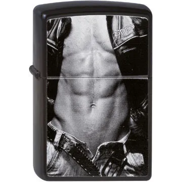 Deze Zippo aansteker heeft een mat zwarte afwerking met een kleurprint, waarop een sixpack een een afgezakte broek te zien is.