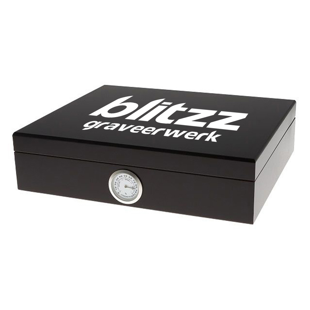 Maak deze humidor onvergetelijk door een eigen bedrijfslogo in kleur te laten bedrukken op de deksel. De print is van hoge kwaliteit en vervaagt niet, waardoor je product jarenlang representatief blijft. Aanvullend kan er ook een tekst bij bedrukt worden, zoals een slogan of bedrijfsnaam, in een kleur naar keuze. Kies uit verschillende lettertypen om de tekst perfect aan te laten sluiten bij jouw huisstijl: