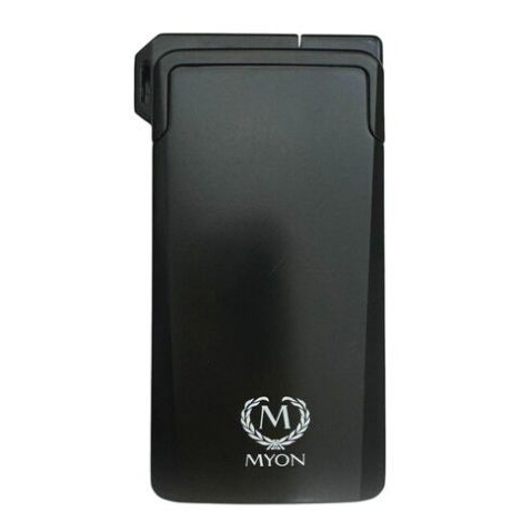 Zwarte Myon pijpaansteker met zowel een zachte vlam vanuit de zijkant voor het ontsteken van een pijp als een krachtige jetflame in het midden van de bovenzijde van de aansteker. De aansteker heeft twee knoppen aan de bovenzijde. Met de ene knop ontsteekt de zachte vlam voor het ontsteken van een pijp. Met de andere knop ontsteekt de krachtige jetflame aan de bovenzijde van de aansteker.