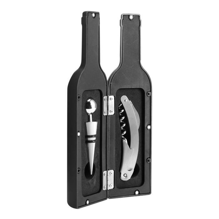2-Delige luxe metalen wijnset, model 'wijnfles', inclusief een mooi vormgegeven wijnstop en flesopener.