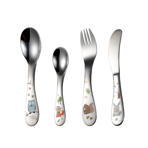 Kinderbestek bosdieren in kleurenprint inclusief graveren