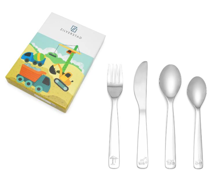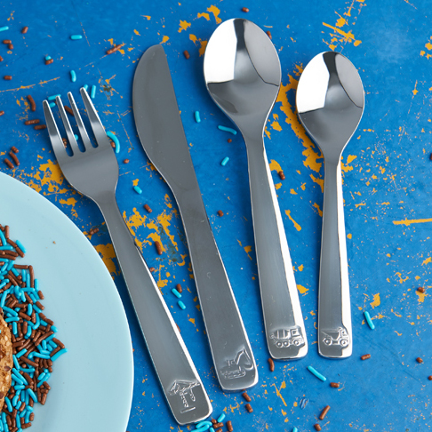 Set kinderbestek met bouwvoertuigen inclusief het graveren van uw eigen tekst.