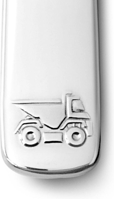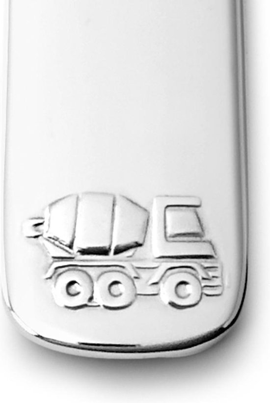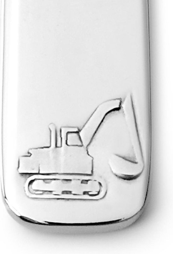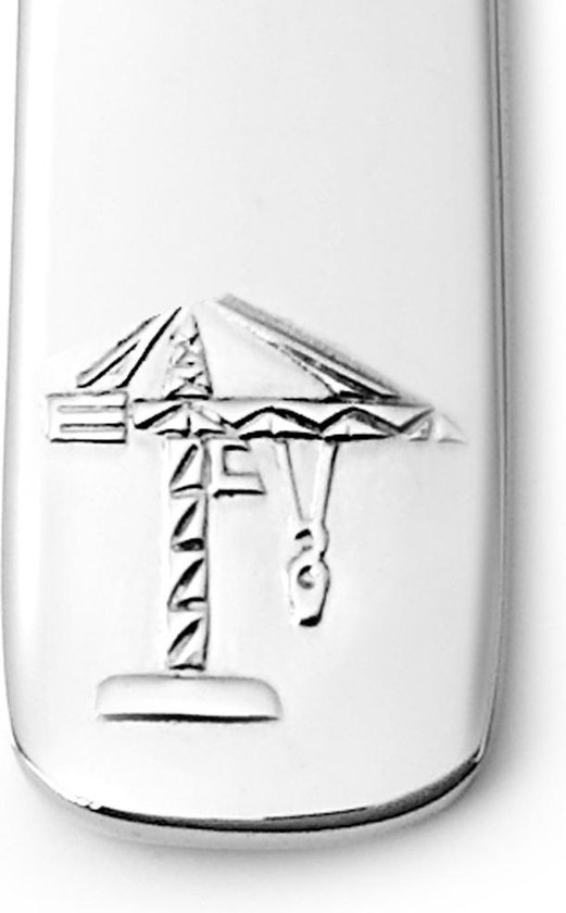- een dessertlepel met onderaan een afbeelding van een bouwwagen.