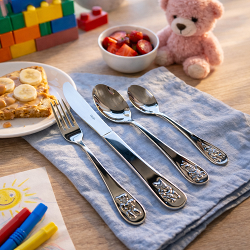 Het kinderbestek is vervaardigd van hoogwaardig 18/10 roestvrij staal (RVS) en bestaat uit 4 delen: