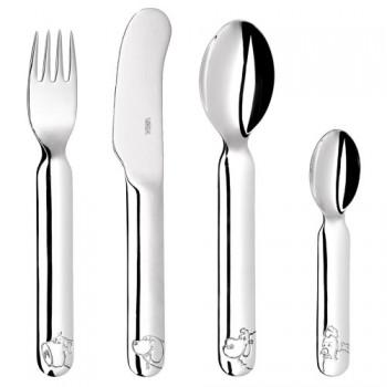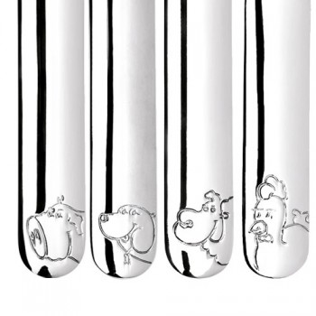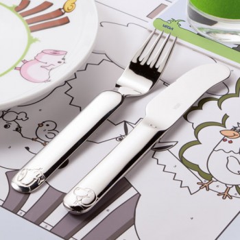 Set kinderbestek met afbeelingen van speelse dieren. Het kinderbestek graveren wij gratis met uw eigen persoonlijke teksten. Laat bijvoorbeeld een naam, geboortedatum, gewicht en/of geboorteplaats graveren in het kinderbestek.