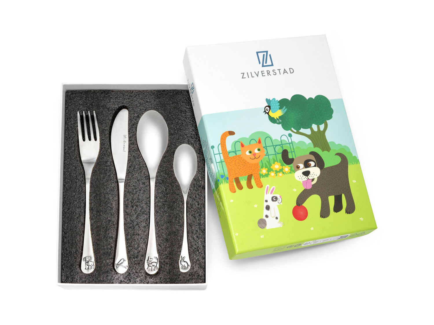 Set Huisdieren kinderbestek met afbeeldingen van Huisdieren inclusief het graveren van uw eigen tekst.