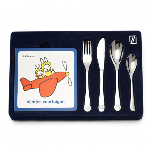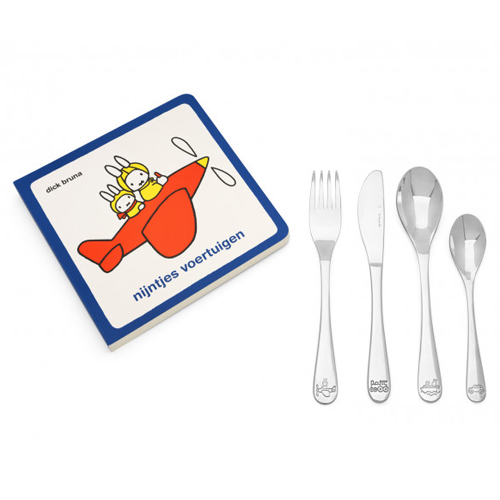 Set Nijntje kinderbestek met afbeeldingen van voertuigen inclusief het graveren van uw eigen tekst. Het kinderbestek wordt in een cadeauset geleverd met een leuk boekje van Nijntjes voertuigen.