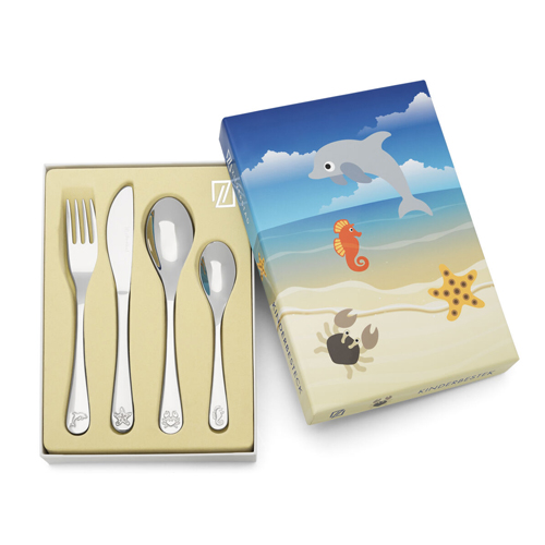 Het zeedieren kinderbestek is van het merk Zilverstad, vervaardigd uit RVS en wordt geleverd in een leuke geschenkdoos.