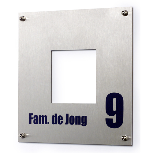 Vierkant naambord van geborsteld RVS in het formaat 20x20cm met een uitsparing.