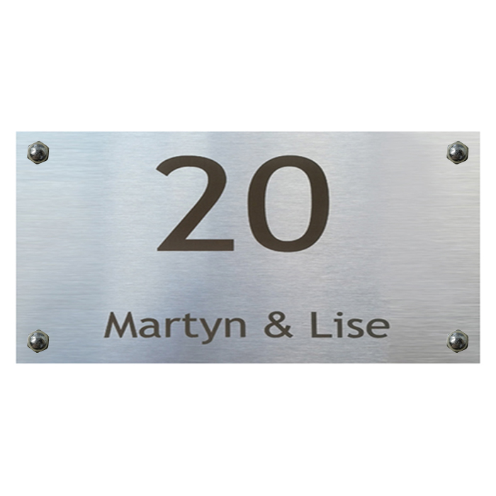 Rechthoekig naambord van massief RVS in het formaat 20x10cm en een dikte van 1mm. Het naambord wordt geleverd met montagegaten en inclusief bevestigingsmateriaal met RVS dopmoeren.