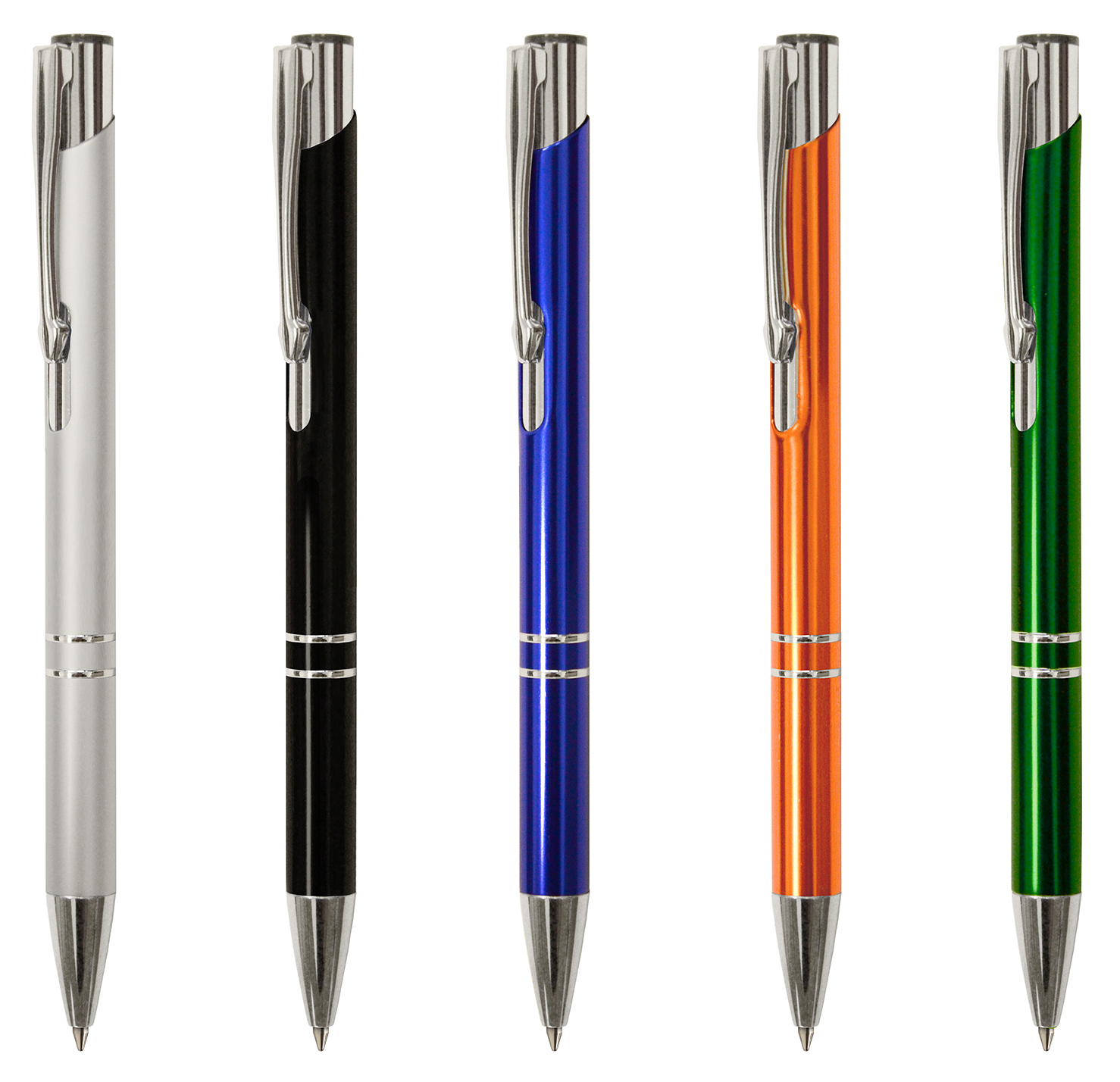 Luxe glanzende balpen van aluminium, verkrijgbaar in de kleuren zilver, groen, blauw, oranje en zwart. Laat de pen graveren met een persoonlijke tekst naar keuze. Graveren kan op zowel de voor- als achterzijde (+€5,00). Maximaal kunt u 35 tekens per zijde laten graveren in de pen.