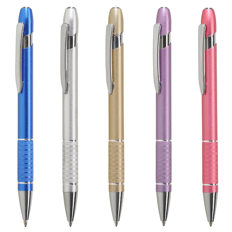 Matte balpen van aluminium en met gripvlak, verkrijgbaar in de kleuren zilver, blauw, paars, goud en roze. Laat de pen graveren met een persoonlijke tekst naar keuze. Graveren kan op zowel de voor- als achterzijde (+€5,00). Maximaal kunt u 35 tekens per zijde laten graveren in de pen.