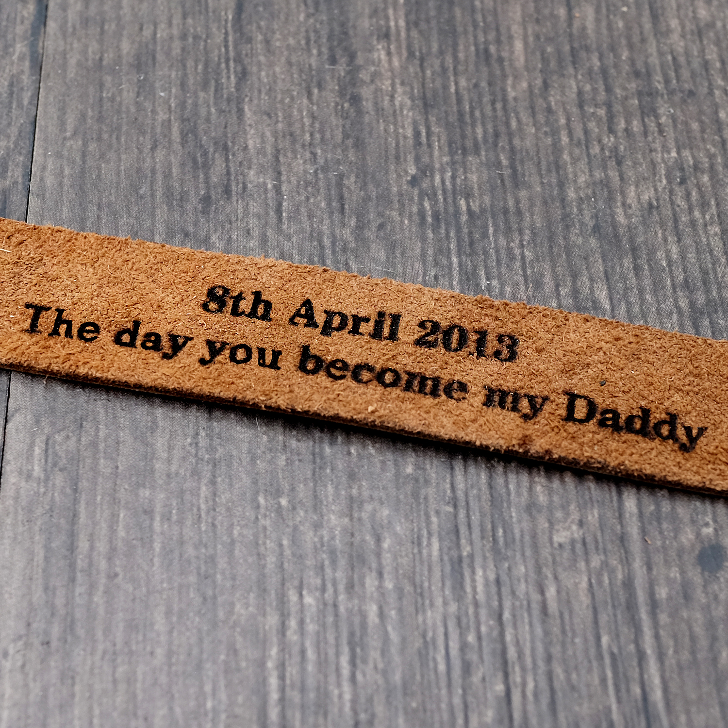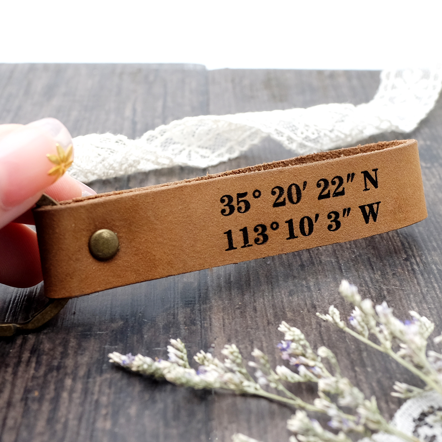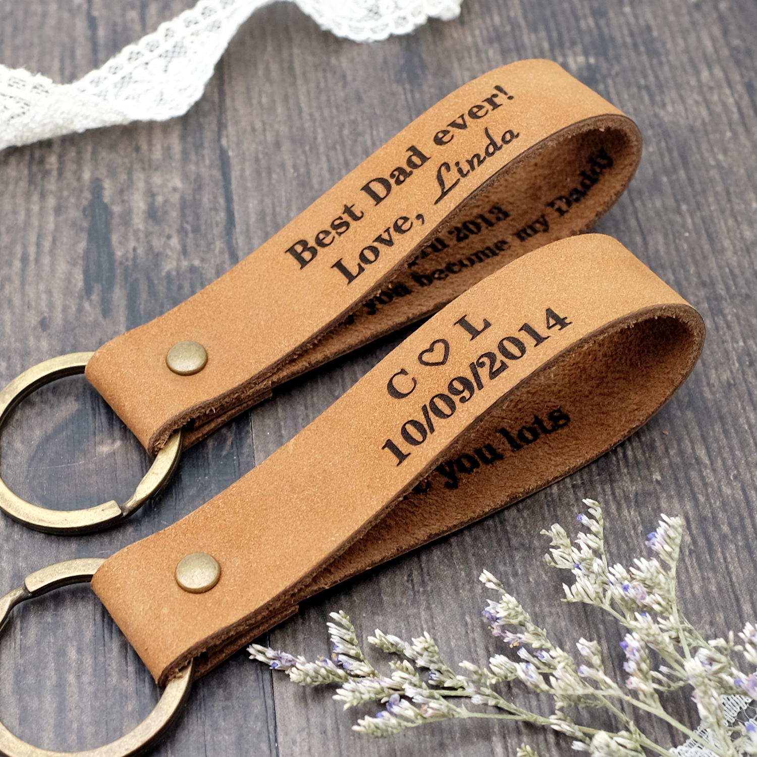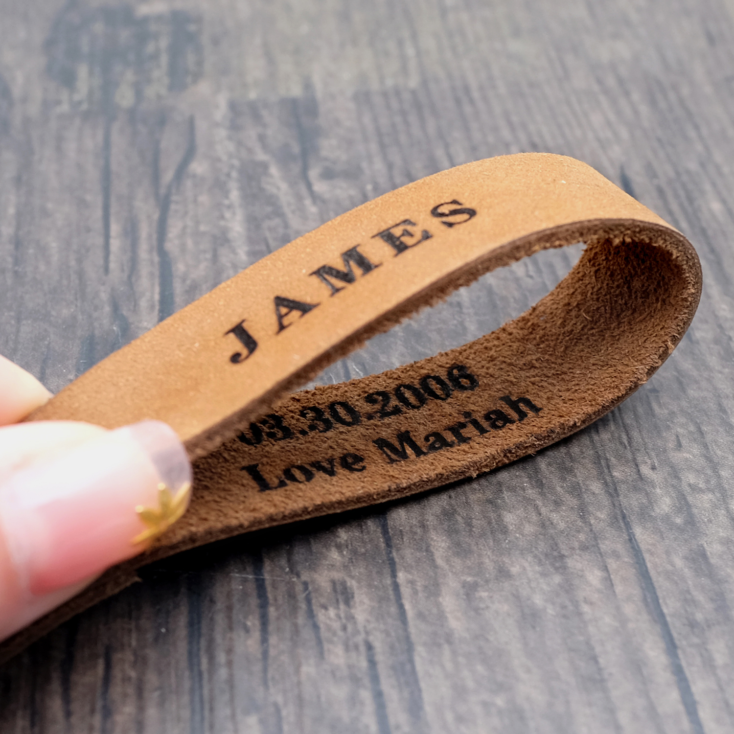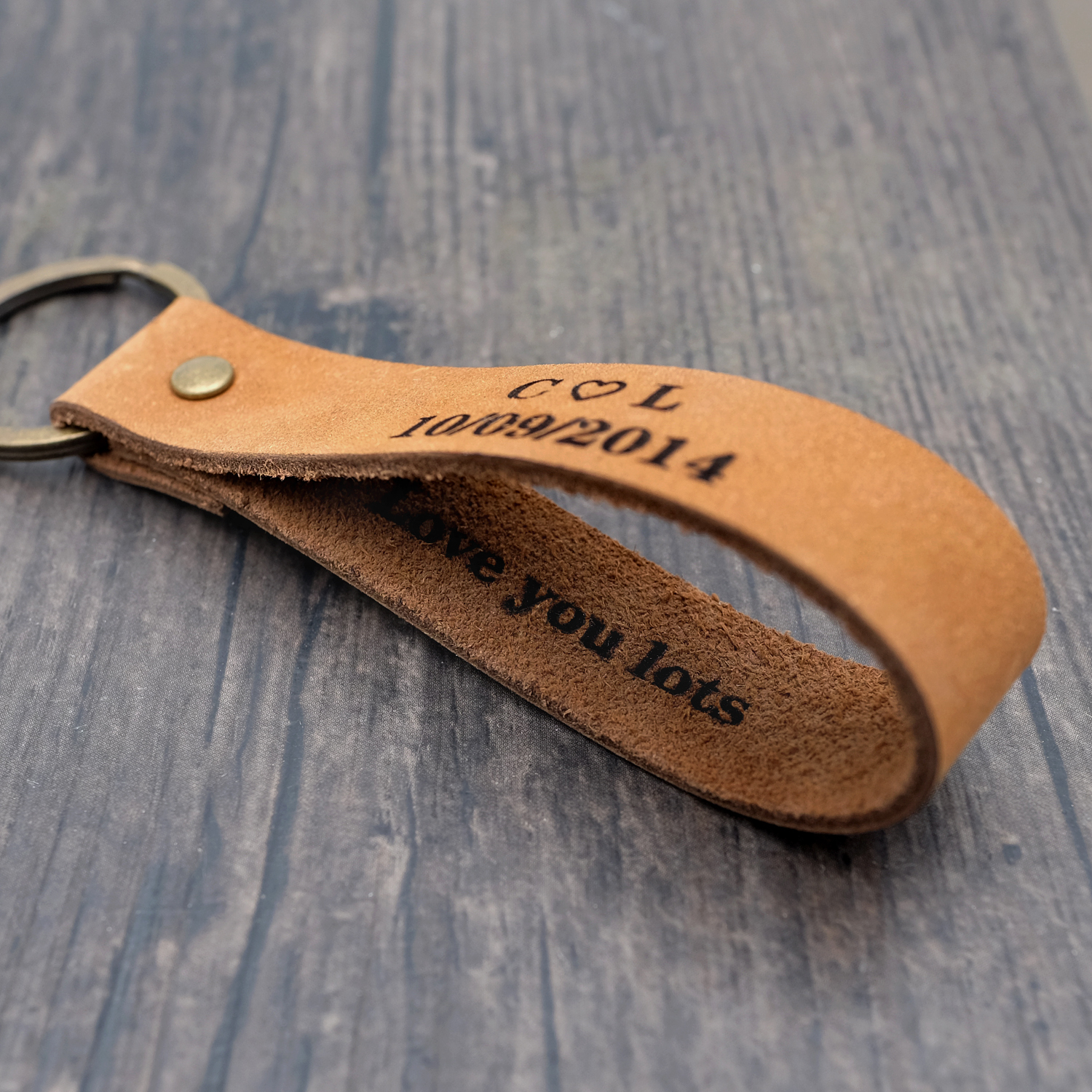 Leren sleutelhanger inclusief het graveren van een eigen tekst aan zowel de binnenzijde als aan de buitenzijde. De tekst voeg je eenvoudig toe in de vervolgstappen.