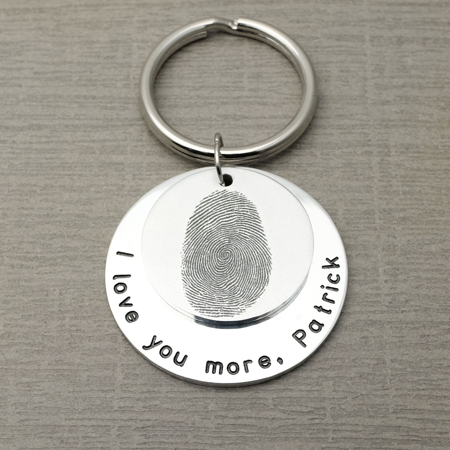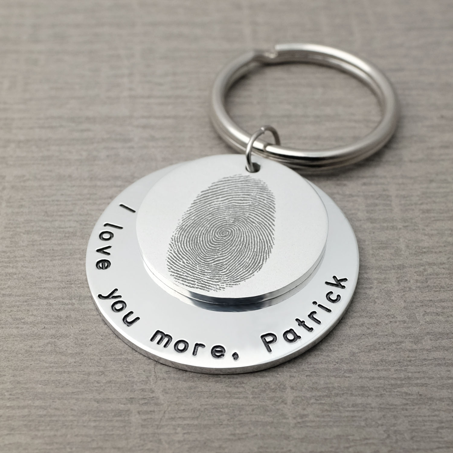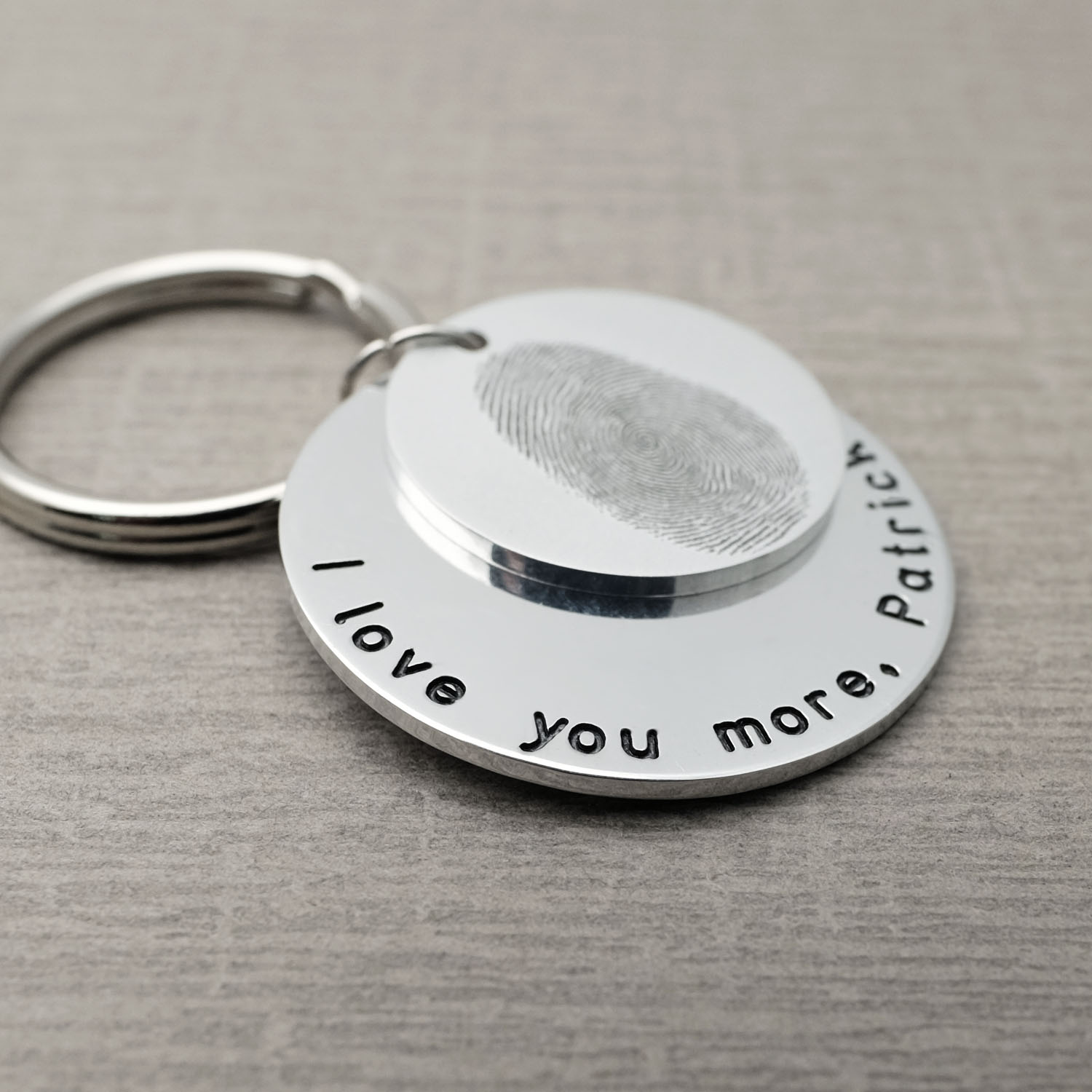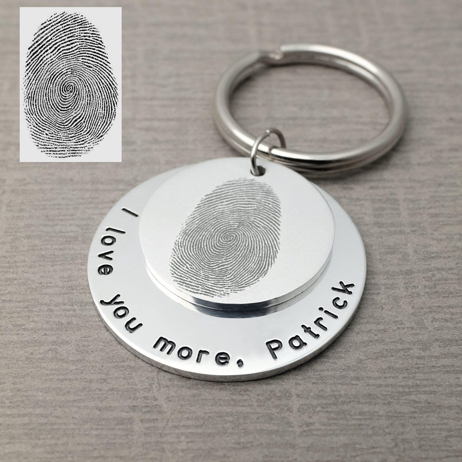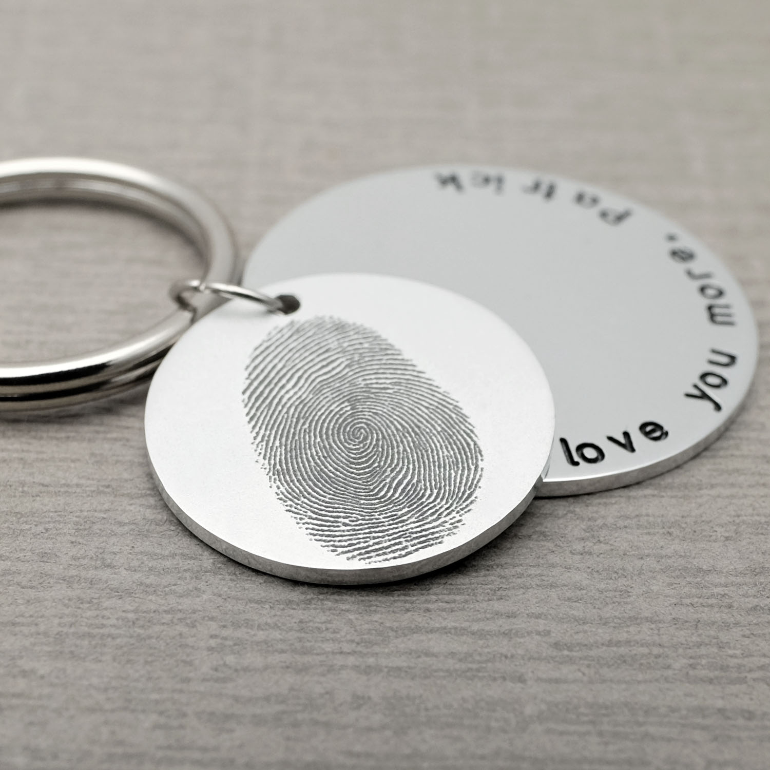 Dubbele cirkelvormige metalen sleutelhanger. Op de kleinste cirkel kunt u een vingerafdruk laten graveren en op de grootste cirkelrand kunt u een eigen tekst toevoegen. De kleinste cirkel is 25mm en de grootste cirkel is 35mm groot.