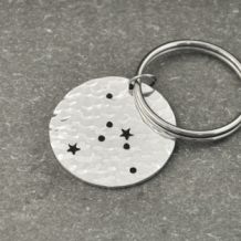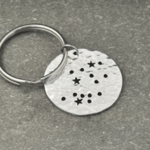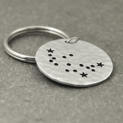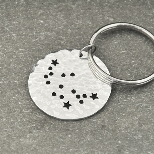 Ronde sleutelhanger van metaal met een ruwe afwerking en aan de voorzijde een zwart ingelakte gravure van het sterrenbeeld Aquarius ( Waterman ) .