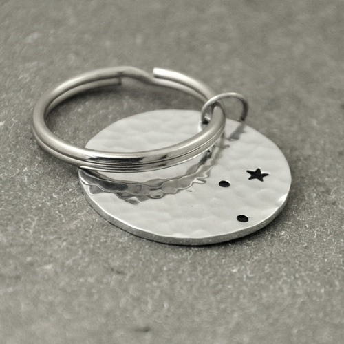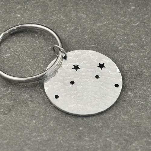 Ronde sleutelhanger van metaal met een ruwe afwerking en aan de voorzijde een zwart ingelakte gravure van het sterrenbeeld Libra ( Weegschaal. )