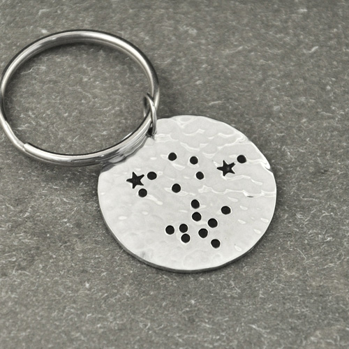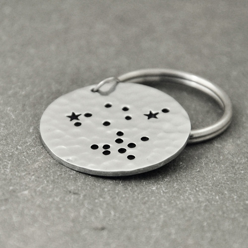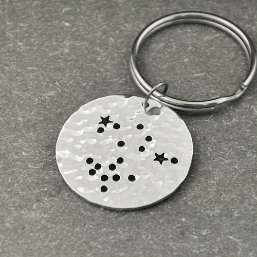 Ronde sleutelhanger van metaal met een ruwe afwerking en aan de voorzijde een zwart ingelakte gravure van het sterrenbeeld Saggitarius (Boogschutter).