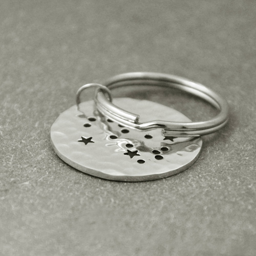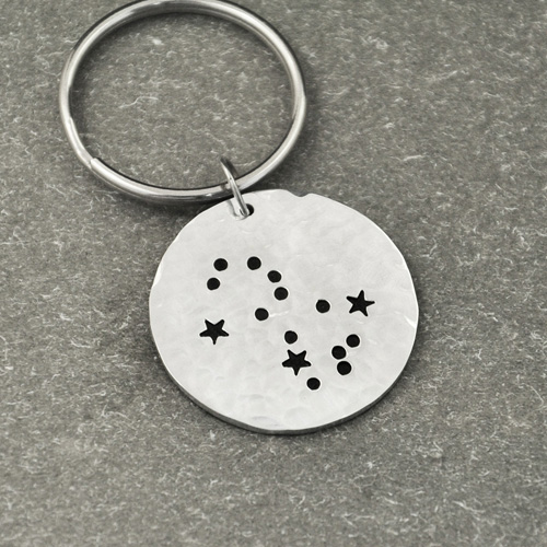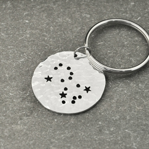 Ronde sleutelhanger van metaal met een ruwe afwerking en aan de voorzijde een zwart ingelakte gravure van het sterrenbeeld Virgo (Maagd).