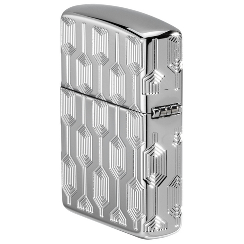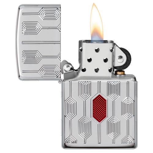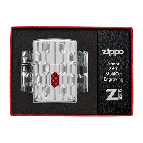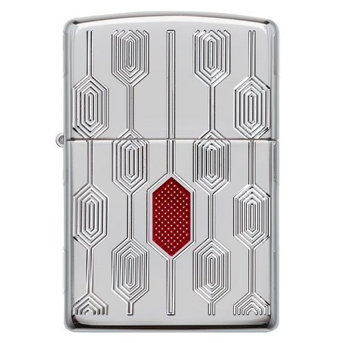 Deze hoogglans chromen Zippo aansteker is een armor case variant en is geheel voorzien van een diep patroon rondom de Zippo. Aan de voorzijde vindt u een rood vlak welke voorzien is van epxoy hars.